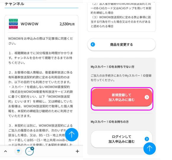 ⑤選択した商品が「WOWOW」になっていることを確認したら、次はMyスカパー!登録手続きに移るので、「新規登録して加入申込みに進む」をクリックします!